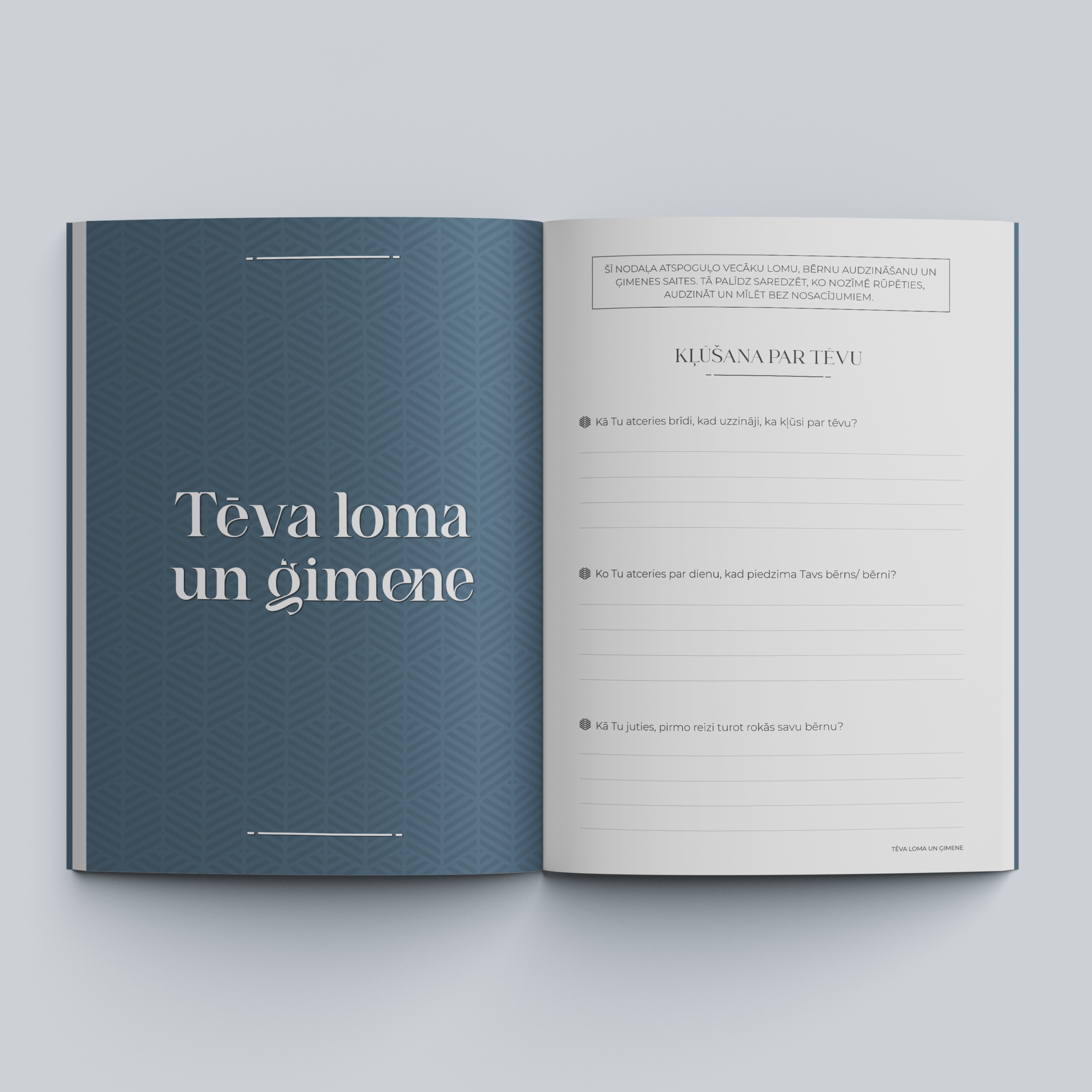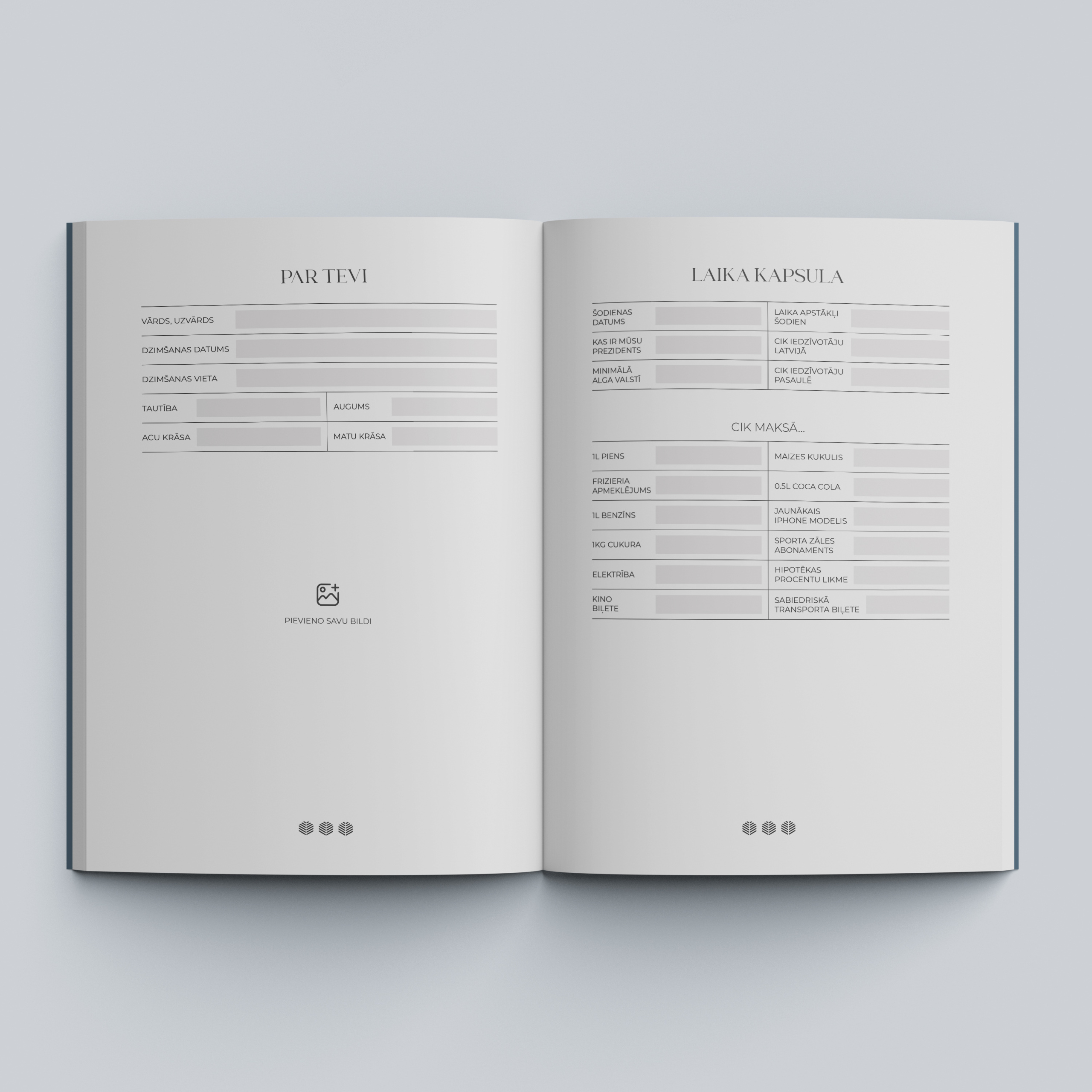 Atmiņu dienasgrāmatas “Tēti, pastāsti savu dzīves stāstu…” un “Mammu, pastāsti savu dzīves stāstu…” ir ceļvedis, kas palīdzēs atgriezties atmiņās un pierakstīt tās. Mūsu atmiņas un pieredze kļūst par patiesu dārgumu tikai tad, kad atrodam laiku tās saglabāt un nodot tālāk. Šī dienasgrāmata ir aicinājums apstāties, pārdomāt un iemūžināt dzīves mirkļus — gan ikdienas notikumus, gan lielos pagrieziena punktus.